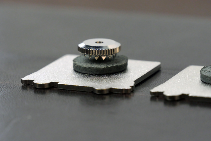 各ピンズには革製のスペーサー(直径約15mm、厚さ約2mm)が1枚付属します。ピンズと留め具の間に差し込むことで、ピンズを装着した際に針先の飛び出しを軽減します。留め具の凹凸にしっかりと噛ませるため、革の床面(裏面)が上向きになるように挟み込んでお使いください。