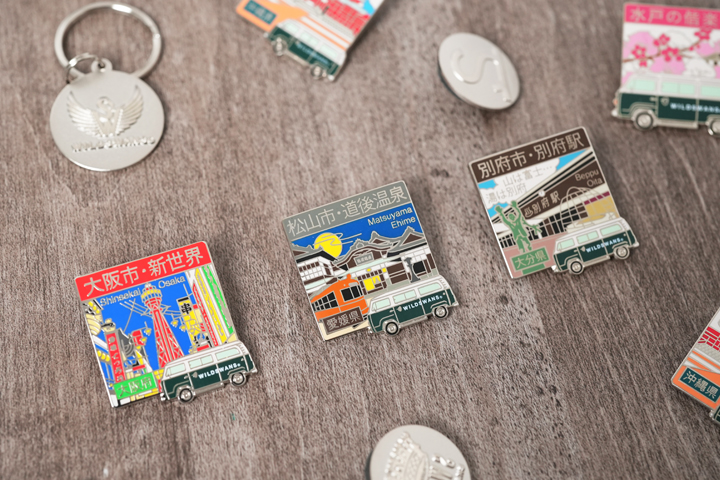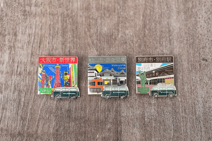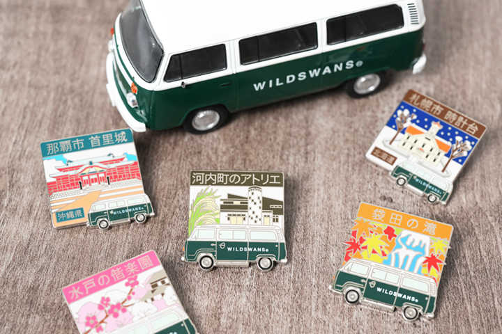 TOUR PINS(ツアーピンズ)はブランド創立25周年のサンクスツアーをコンセプトに、WILDSWANSのワーゲンバスが日本各地を回る様子を描いたオリジナルピンズです。茨城県各所を描いた「TOUR PINS IBARAKI」と、他県を巡る「TOUR PINS JAPAN」の2シリーズを展開していますが、今回新たに3種類のピンズがTOUR PINS JAPANに加わります。 (WILDSWANS オリジナルピンズの詳細はこちらをご覧ください。)