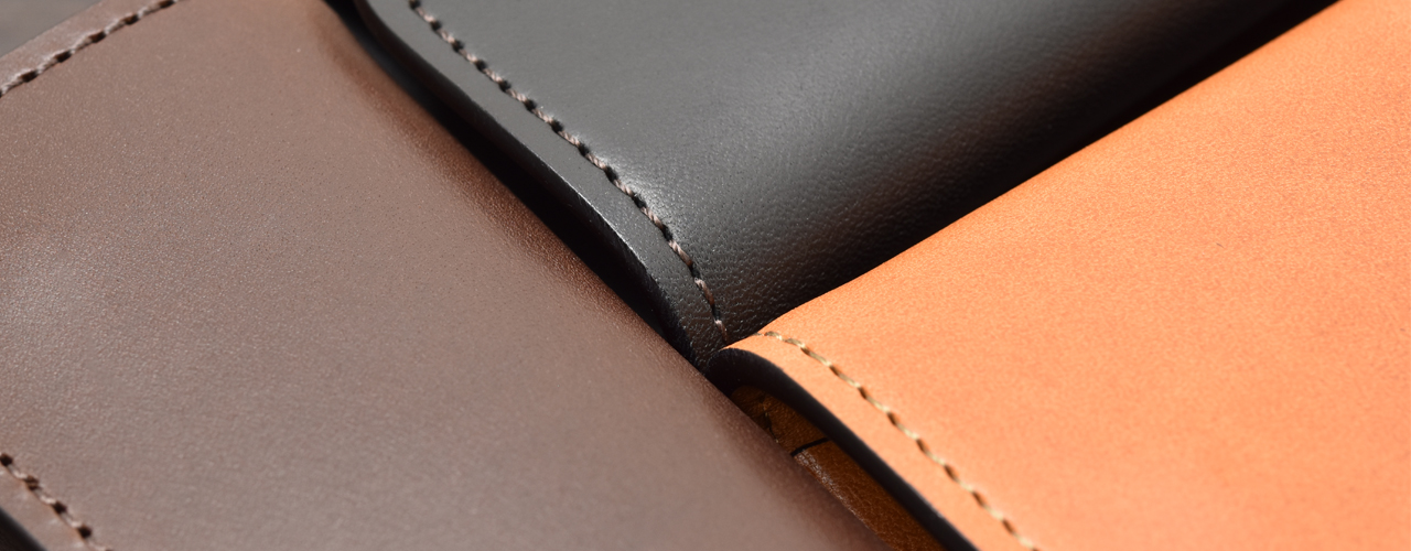サドルレザー(SADDLERY)は丁寧にタンニン鞣しをされた堅牢な皮革で、名前の通り実際に馬具に使用されています。皮革の表面はベタ付くことなくさらっとした手触りですが、皮革内部にはしっかりと油分が蓄えられています。新品の状態ではややマットな風合いですが、使い込むにつれて強い光沢を帯びていきます。また、革自体はがっしりと堅牢な印象で、実際に手に取ってみるとコシやハリが強く、繊維密度の高さが伺えます。硬い革ですので傷は付きますが、皮革のギン面(表面)が強く、一般的な皮革と比べても傷が付きにくい特徴があります。サドルレザーは表面に研磨などの加工を施さないフルグレイン仕上げのため、皮革本来の自然な表情を保ったままの素材で、同じ素材・カラーであったとしても多彩な表情を見せてくれます。