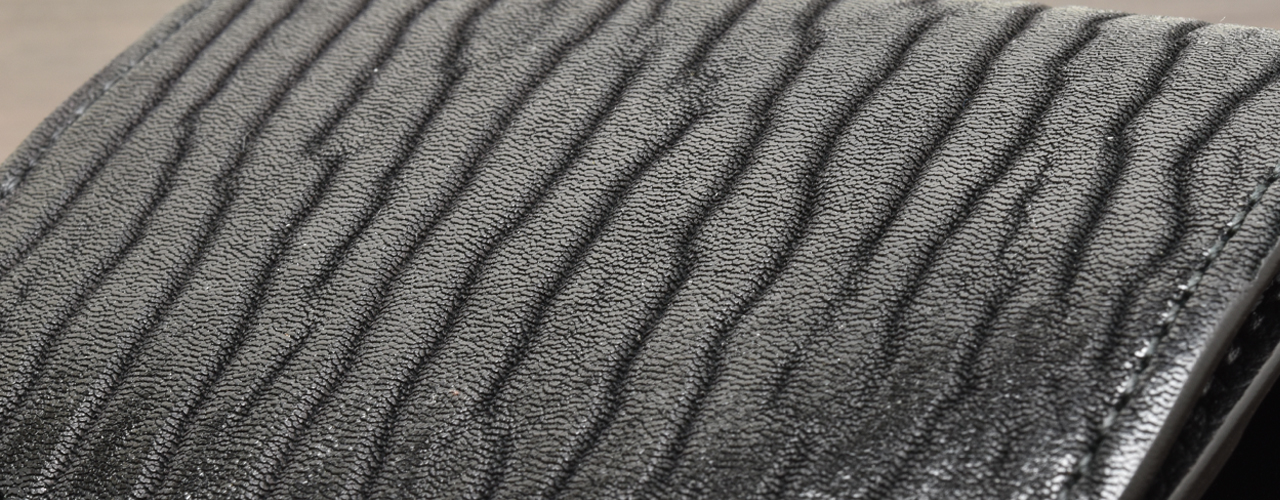 ハープシール(和名:タテゴトアザラシ)は北大西洋や北極海に広く分布するアザラシの一種で、オスの背中に竪琴のように見えるU字型の暗色の斑紋があることからタテゴトアザラシ(英名:Harp Seal)と呼ばれています。ハープシールレザーには毛が付いたままの皮革と毛を除去した毛無しの皮革がありますが、毛無しの皮革は毛を抜く専門の職人が少ないため、毛付きの皮革よりも珍しいとされています。軽くてしなやかな手触りですが、堅牢で耐久性も非常に高い素材です。皮革の表面は波打つような縞模様が同じ方向に走っており、まるで畑の畝(うね)のようで手で触れても凹凸の感触がしっかりと伝わって参ります。「頭張り」と呼ばれる、皮革の盛り上がった部分に光沢を出すような仕上げによって濃淡のグラデーションが生まれることで、立体感と高級感のある独特の表情を生み出しています。