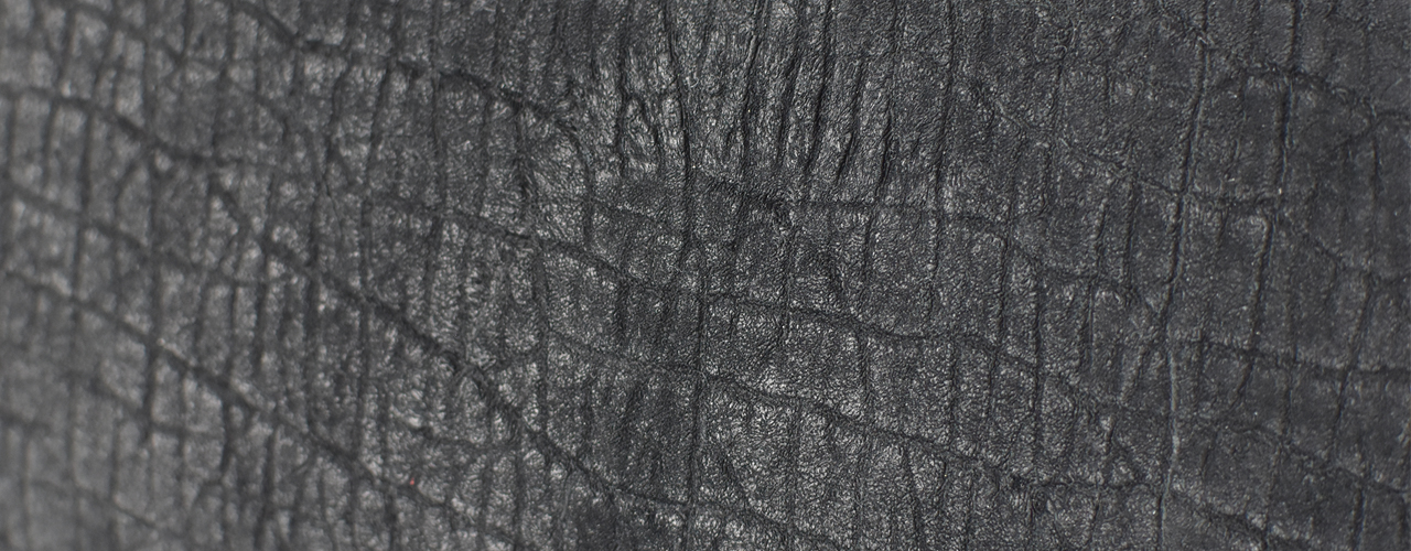 ヒポポタマス革はワシントン条約により厳しく規制されている大変希少な皮革で、数あるエキゾチックレザーのなかでも非常に強度の高い皮革です。皮膚はなめらかで、厚い上皮と真皮、及び極めて薄い表層(角質層)から構成されています。その表層を取り除いて鞣された革は、表面がヌバック・スエード状に起毛されており、ヴェルヴェットのような上品な手触りが特徴です。また独特な表面のシボやヒダの模様は部位によって様々で、ひとつひとつ違った個性的な雰囲気が魅力です。耐久性に於いては模様の違いでの差異はなく、基本的にはどの部位も非常に丈夫で、高い強度と耐久性を誇る皮革です。また部位によっては生体時についた深い傷があるという特徴もあり、そのような荒々しく無骨で野性味溢れる表情も魅力の一つとなっています。