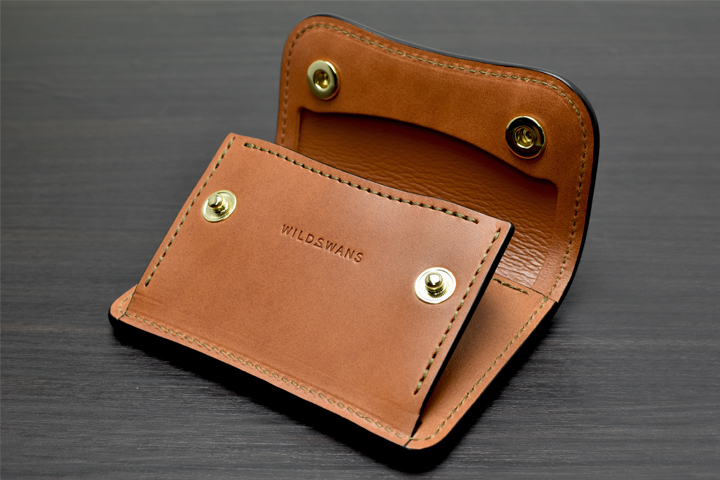 本体の背面にはカードポケットが付属します。 WILDSWANSのミニ財布などにもよく見られる背面のポケットは出し入れがしやすく、それでいてカード自体は上部中央3mm程を残して完全に隠れますので、様々なカードを確実に収納することが出来ます。