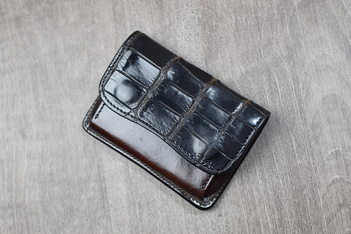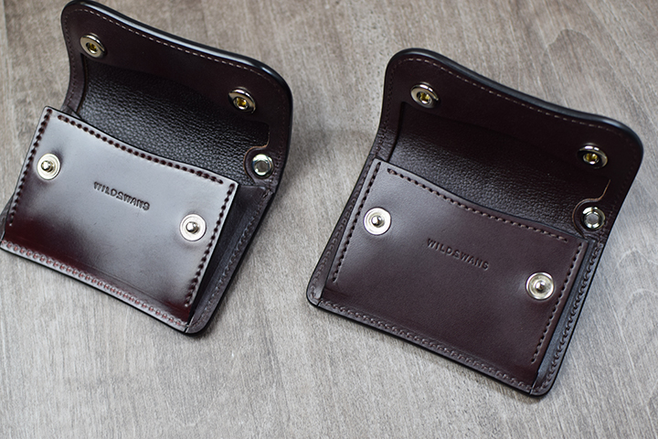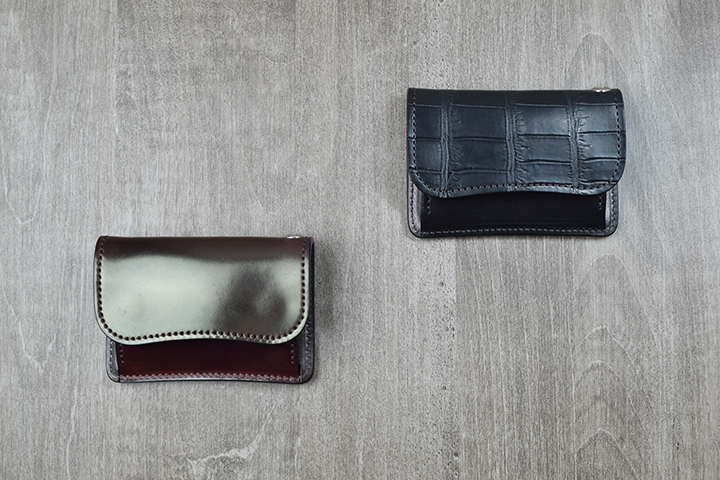 コインケースの前胴部分は、画像左のシェルコードバンでは同素材のシェルコードバンを用いていますが、画像右のクロコダイルではイングリッシュブライドルを組み合わせています。この部分は二つのバージョンにおける大きな違いとなります。使用前は少しマットなイングリッシュブライドルですが、使用していくと少しずつ光沢が現れます。