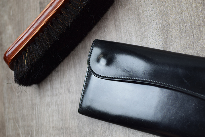 シェルコードバン自体、曲げ伸ばしや引き裂きに強い、耐久性の高い皮革ですが、汗や水分、汚れに対しては弱い性質があるため、これらを極力避けながらご使用ください。また、シェルコードバンの皮革内部には豊富な油分を蓄えているので、皮革用クリームはそれほど使用して頂く必要はありません。このため、ブラッシングと柔らかい布を使用しての乾拭きが基本的なメンテナンスとなります。なお、シェルコードバンは表面に微細な繊維で構成されているため、製品の折り曲げ部分を中心に所々毛羽立ちがありますが、こちらは使用していく過程で少しずつ寝かされて、滑らかな質感に落ち着いてきます。