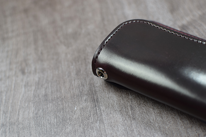 使用するとさらに鋭い光沢を帯びて、カラーによっては色の度合いが深まります。こちらの画像はスタッフが1年程度使用したシェルコードバンWAVE/ブラックです。光沢もさることながら、使い込むことで手に吸い付くような独特の質感に変化する部分も見逃せません。
