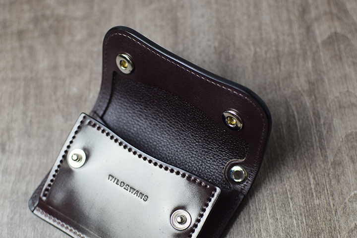 コインケース自体は、両マチ仕様で内部の収納量に応じて大きさが変動します。また、コインケースの前胴部分を手前に引くことで内部が見やすく、中身が取り出しやすい設計です。 なお、こちらのマチ裏については、クロコでは裏貼りが施されていますが、シェルコードバンでは裏貼りが無く、マチの表側に使用したイングリッシュブライドルレザーのトコ面(革の裏側)がそのまま現れる仕様となります。このため、トコ面にはイングリッシュブライドルレザーの染料が染み出した跡が残ることがありますが、こちらは皮革及び製品の特性となりますのでご了承ください。