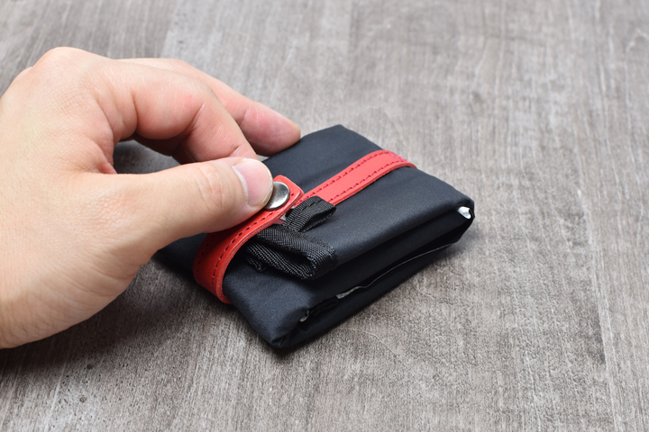 最後に本体底部分のホックに先ほど外したベルトの先端を留めることで折り畳みが完了します。