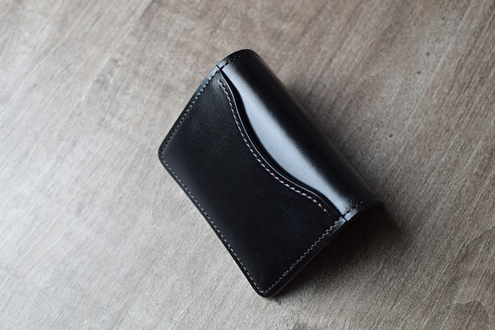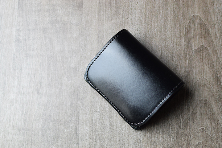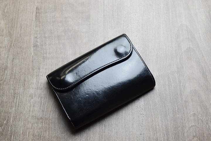 こちらはブラックのサンプルで、モデルは中型三つ折り財布・BYRNE(バーン)です。使用から約5年が経過したサンプルです。