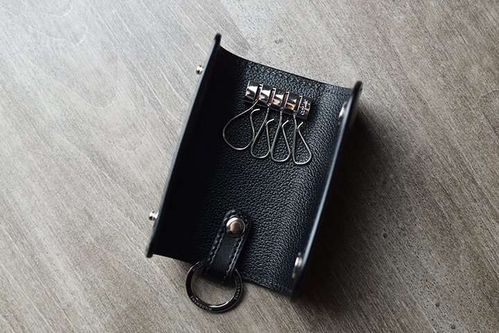 ホックを外すと4連のキーフックを備えた内装が現れます。キーフックの下にはホックで取り外しが可能な2重リング付きのパーツをご用意しています。