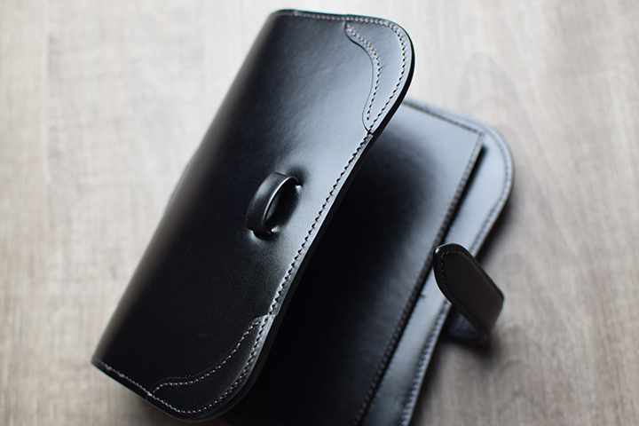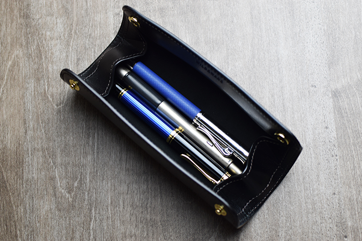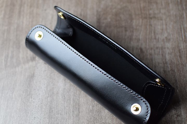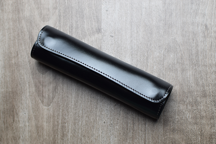 続いては久しぶりの登場となるステイショナリーアイテム。こちらも筒状の形状ですがペンケースのため、ペンが落下しないよう革が全体を覆うような形状です。
