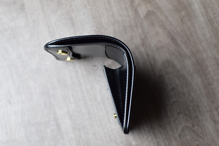 内装部分のコイン収納スペースは両サイドに収納量に応じて可動するマチを装備しています。また、こちらの内部には革の仕切りがあるので、カードまたは緊急用に折りたたんだ紙幣等も収納できます。