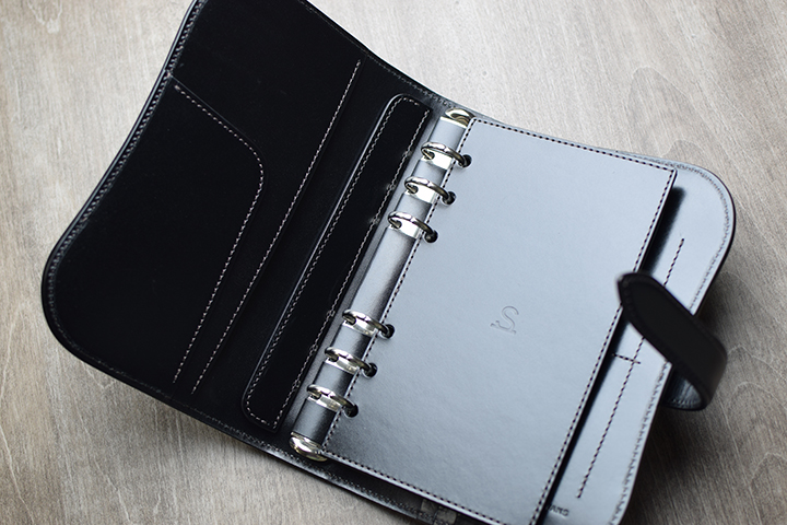 内装も圧巻の仕様で専用の下敷きからポケットに至るまで、惜しげもなくサドルプルアップが使われています。リフィルは、6穴式のバイブルサイズに対応しています(リフィルは付属しておりません)。