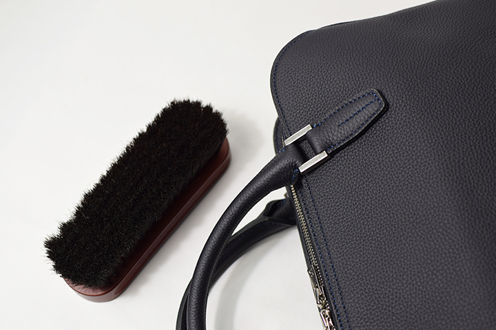 ハンドルは一般的なブリーフケースのそれとは異なる、緩やかなカーブを描いたデザインです。ショルダーストラップが付属しないLANCELOTですが、手に掛かる圧力が分散され長時間持った際も疲れにくくなるように配慮されています。
