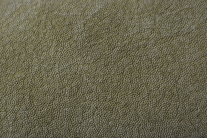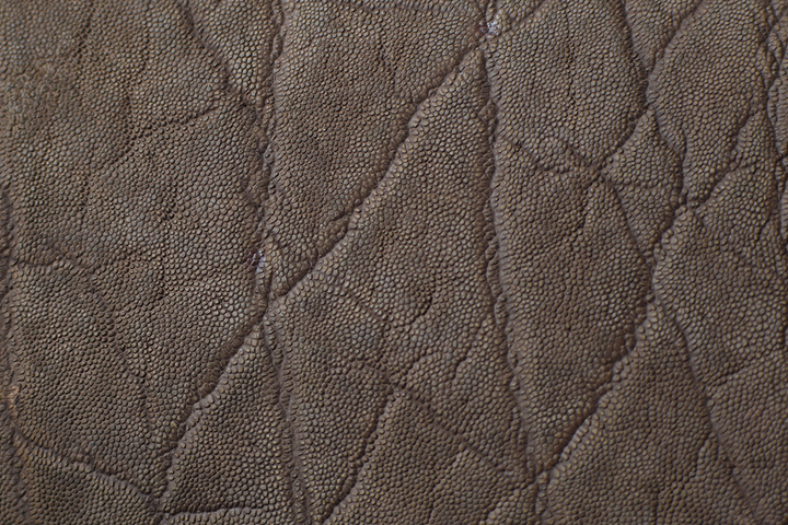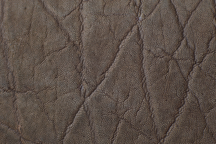 皮革表面には無数に現れる細かいシボ(凹凸)が確認できます。また、シボの間には太いシワや毛穴の跡などが生々しく残ります。とても貴重な皮革ですが、引き裂きや曲げ伸ばしなど牛革などの一般的な皮革と比べても申し分ない強度を備えています。