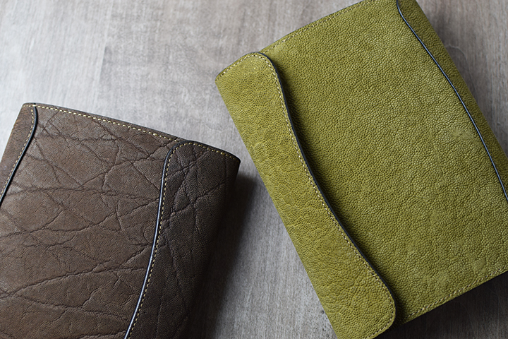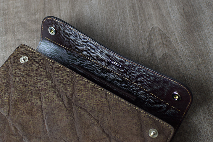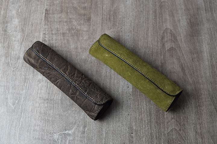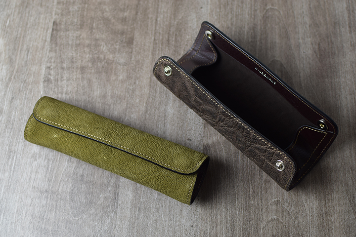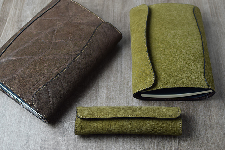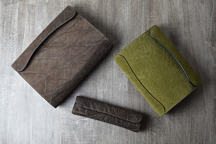 カーキ。こちらは少し遊びをきかせたユニークなカラーです。 これまでWILDSWANSでは、財布をはじめとした革小物を中心にエレファントレザーアイテムを展開してきましたが、今回はステイショナリー(文具)にスポットを当てた3つのアイテムを製作してみました。