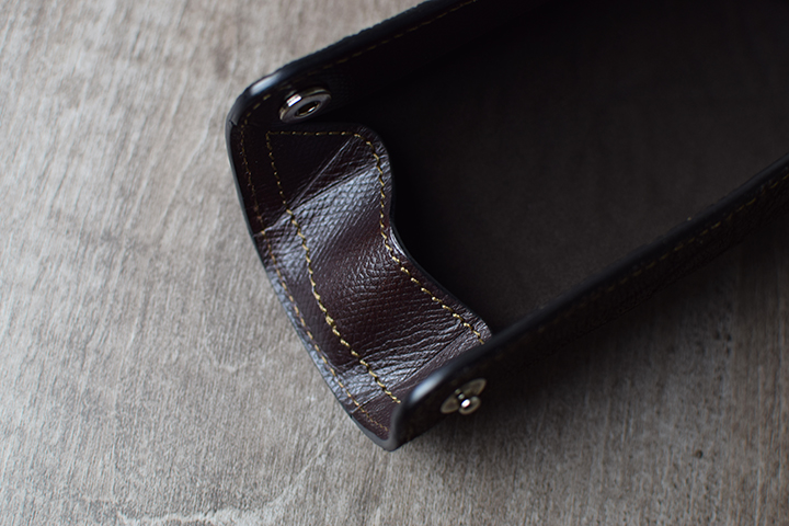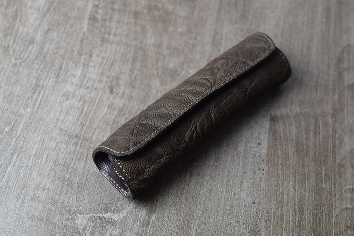 本体の両側面のマチは、型押し加工を施したサドルプルアップのチョコで製作したパーツです。しっかりとしたハリ感でペンの落下を防ぎます。