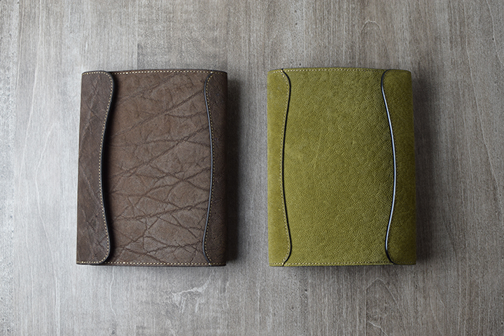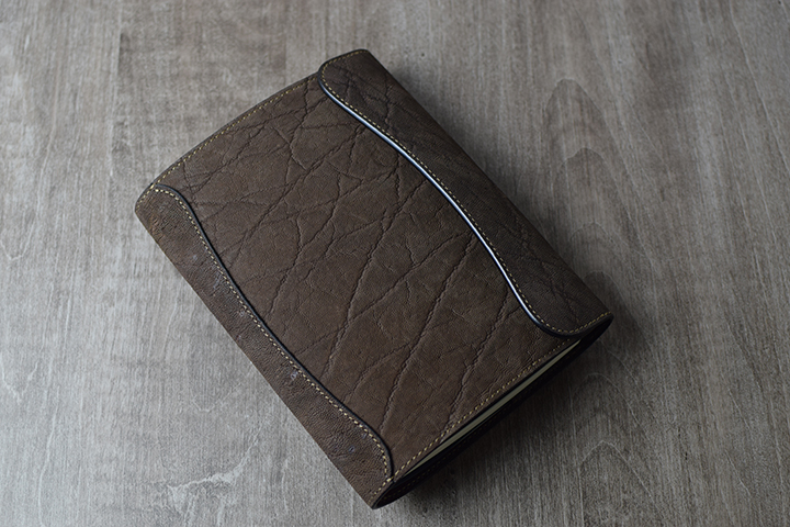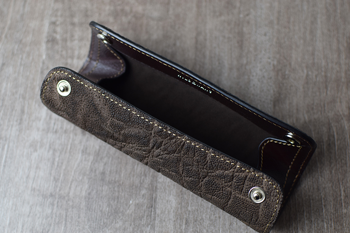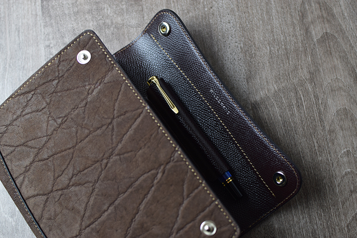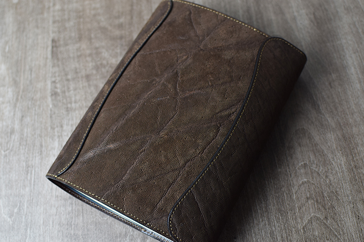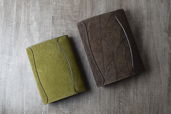 CYLINDER-Sと同じく、外装は全てエレファントレザーです。少し見えにくいかもしれませんが、本体の補強箇所である背当てもエレファントレザーです。B6、A5とも板面が大きいので、これまで展開してきたエレファントレザーのウォレット系アイテムとは段違いの迫力です。