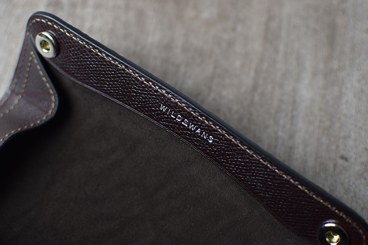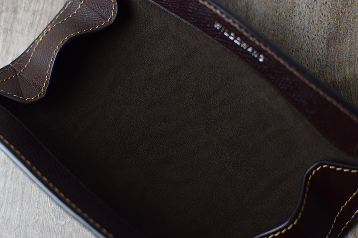内装の縁部分にはWILDSWANSのロゴがキラリと輝きます。側面同様にこちらにも型押しのサドルプルアップのチョコを組み合わせています。