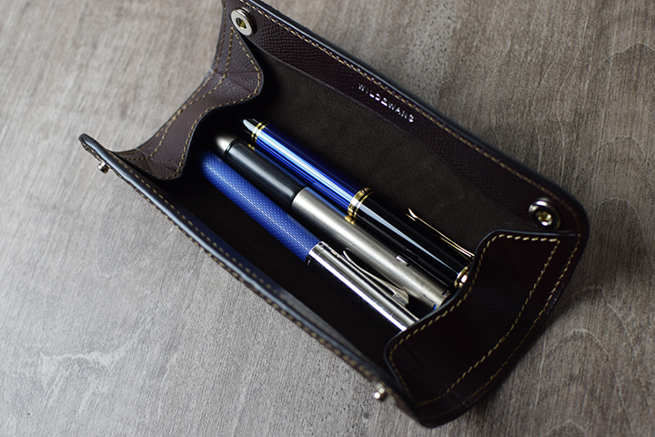 実際にペンを入れてみましょう。一般的な長さ(15㎝程度)のペンでしたら両側面のマチがペンをしっかりと抑え込みます。中軸のペンの場合、収納本数では3~4本程度となります。