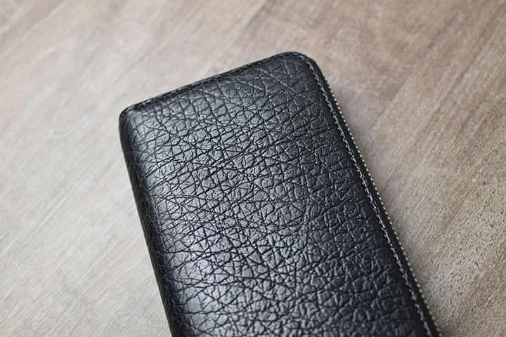 使用前のエレファントレザーは表面に起毛があるため、全体的にもフカフカとした質感です。しかし、使用時において皮革表面に繰り返し摩擦がかかると、ゆっくりではありますが少しずつ光沢が現れ、使用前とは明らかに異なる独特の風合いに変化します。上の画像ではスタッフがサンプルで使用したブラックのエレファントアイテム(ラウンドファスナー長財布・KF-001)を掲載しています。表面にテカテカとした艶が輝き、手触りもスベスベした質感に変化します。参考までに、こちらの使用期間は4年です。少しずつ少しずつ変化する特性の皮革です。