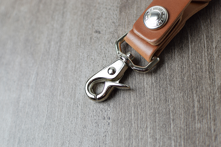 ホックの先にはナスカンと呼ばれる金属パーツがあります。最先端部にはレバーがあり、こちらを開閉することで、ベルトループや鞄のDカンなどに接続させます。こちらのナスカンはレバー部分との接続部分が動作に合わせてクルクルと回転する仕組みになっているため、金属やシェルコードバンの帯部分に負担が掛かりにくくなっています。