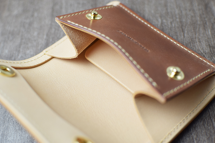 コインケースの内部には革の仕切りがあり、手前にコイン、奥にカードといった収納方法も可能です。