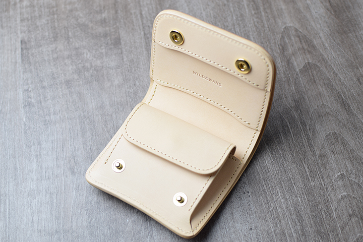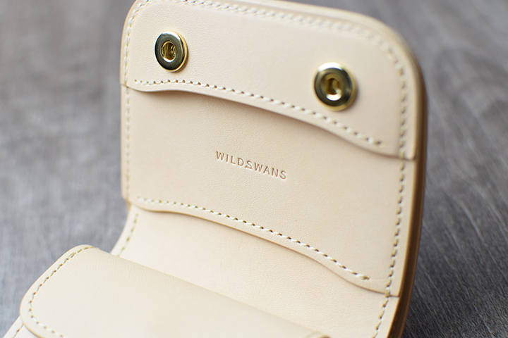 フラップを開くとコインケースの前身部分が現れます。中央にはWILDSWANSのブランドロゴが刻印されています。2種類のナチュラルカラーとゴールドカラーのホックが相まって上品なアンティーク感が漂います。