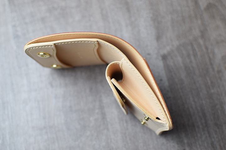 TONGUEと同じように、コインケースの両サイドにはマチがありますが、TONGUEと比べるとかなりマチに幅があります。上の画像では扇のように広がったCASAのマチを撮影しています。