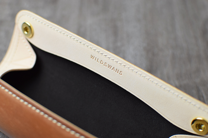 アイテム全体に統一感が生まれるように、内装部分にはサドルプルアップのナチュラルを組み合わせました。サドルプルアップはWILDSWANSがブランド創立当初から20年以上製作用いているベルギー・マシュア社の堅牢度の高い牛革です。しかし近年は、供給悪化の一途をたどっているため、WILDSWANSにおいてもサドルプルアップを用いたアイテムを製作することが少なくなっています。現在でもブラックやチョコのサドルプルアップアイテムはスポット的に登場する機会がありますが、ナチュラルカラーのサドルプルアップを目にすることは、とても珍しくなりました。今回内装に組み合わせたサドルプルアップのナチュラルは、シェルコードバンのナチュラル同様、エイジングの度合いの大きなカラーですが、シェルコードバンのナチュラル以上に濁りの無いピュアな表情です。