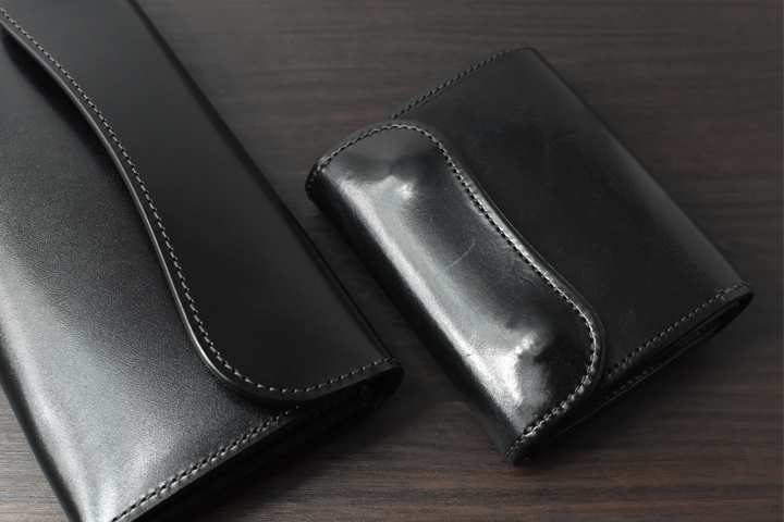 サドルプルアップは潤沢に含まれたオイル分により、驚くほどのエイジングを遂げます。新品時とは異なる自然で透明感あふれる光沢が表面に現れ、チョコ色のアイテムであれば、段々と味わい深い色味へと変化します。革製品の悩みの一つである使用中の傷ですが、サドルプルアップはオイル分が馴染むことにより、浅い傷であれば徐々に消えてしまいます。一方で表面がえぐれるような深い傷や、引きつったような傷は消えることなく残りますが、表面の光沢感と相まってむしろ上質なアンティーク品のように感じます。また、サドルプルアップは耐久性に優れた皮革であり、長く使用した製品であってもハリ感は維持したままです。