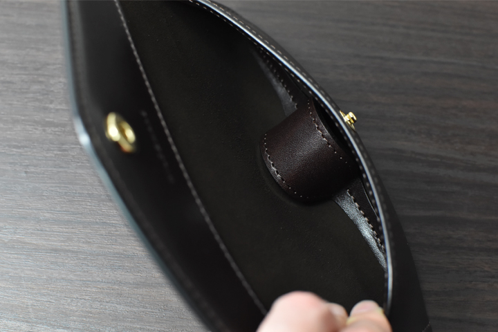 2つのホックで留められた筒状のペンケースです。左右に配置するマチが中に収納したペンを抑えるように折れ込むため、ペンが飛び出てしまうことはありません。