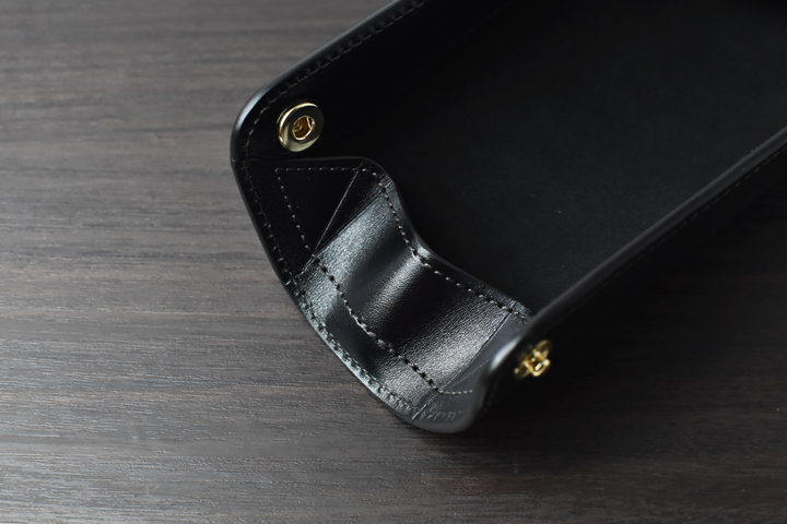 内装に貼られたスエードと、底部分の中央に固定された革パーツが大切な眼鏡を守ります。 (大ぶりな形状、特殊な形状などの眼鏡は収納出来ない場合がございます。)