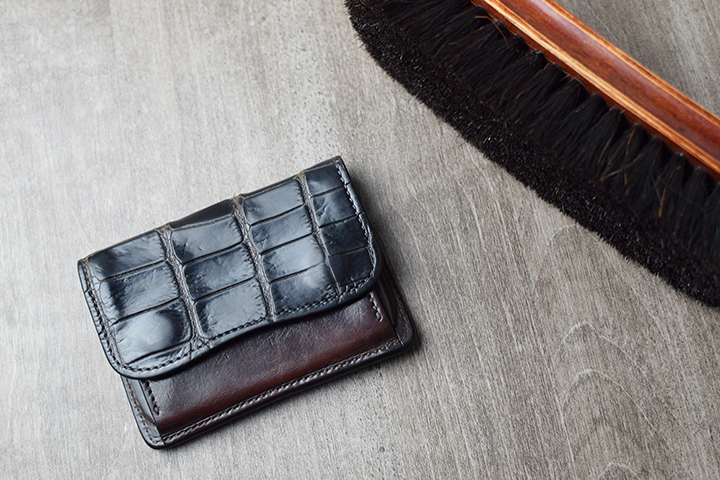 山なり部分の革は、型押しのイングリッシュブライドルレザーです。クロコの裏貼り部分は全てこちら皮革を組み合わせています。イングリッシュブライドルレザーはWILDSWANSではメイン素材としても用いられるコシが強く、耐久性の高い皮革ですが、クロコ部分の裏貼り革となることで、製品に抜群の安定感をもたらします。