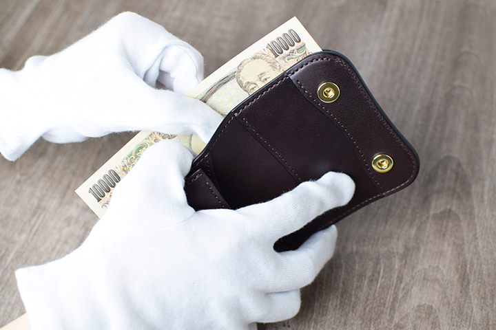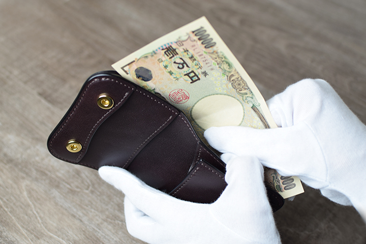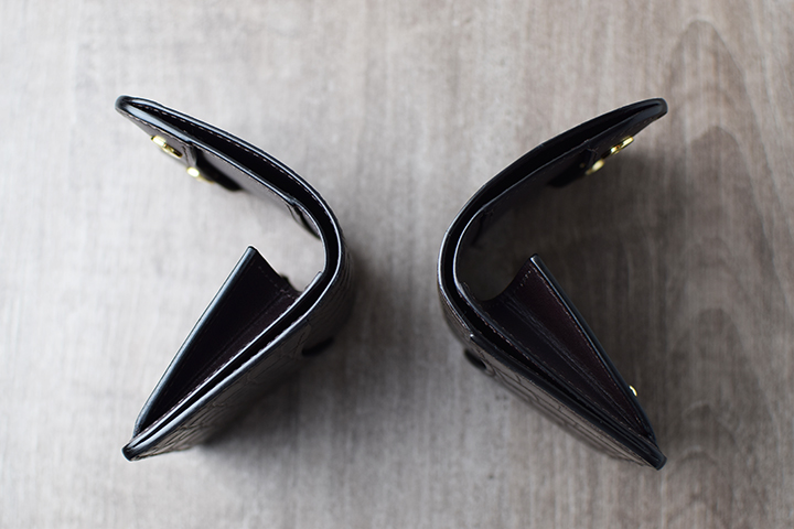 このようにPALM-V2-LEFTYは、札室入口の向きを従来のPALMとは反対に設けることで、文字通り左利きの方が扱いやすいミニ財布に仕上げています。もちろん使い方や感覚には個人差がありますので、左利きの方でも、従来のPALMの方が使いやすいといったケースもありますので可能であれば、実際に店頭で触れて確認をして頂くことをおすすめ致します。