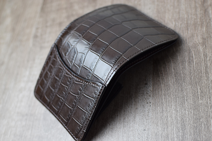 二つ目はクロコダイルです。天然のクロコダイルは、皮革表面に現れる斑柄が、一つ一つ異なります。こうした個性的な表情に加えて、高い耐久性も持ち合わせています。こちらの内装にもイングリッシュブライドルレザーを組み合わせています。皮革内部に豊富な油分を蓄えているため、使用すると皮革表面に重厚な艶が現れます。