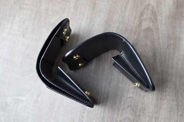 一つ目は、シェルコードバンです。高級紳士靴にも用いられるシェルコードバンは、キメが細かくシワになりにくい皮革です。同時に曲げ伸ばしや引き裂きにも強い、高い耐久性も備える皮革です。内装はアメリカ牛革のイングリッシュブライドルレザーです。使用しても皮革のコシが抜けにくい耐久性に優れた皮革です。