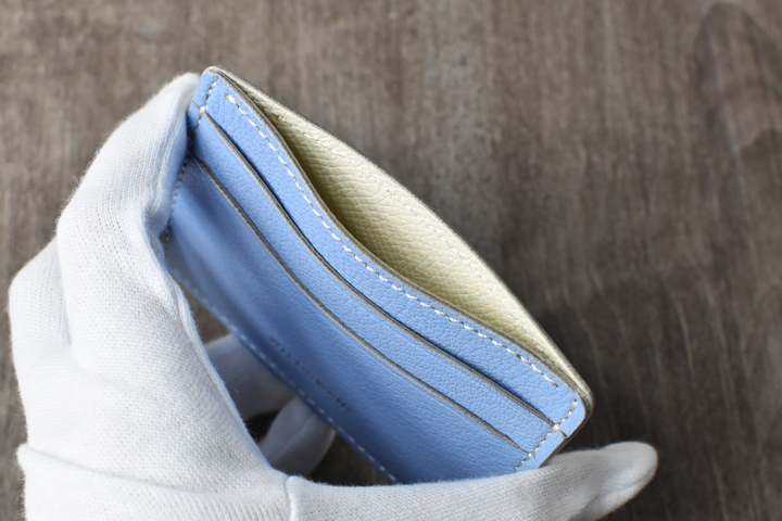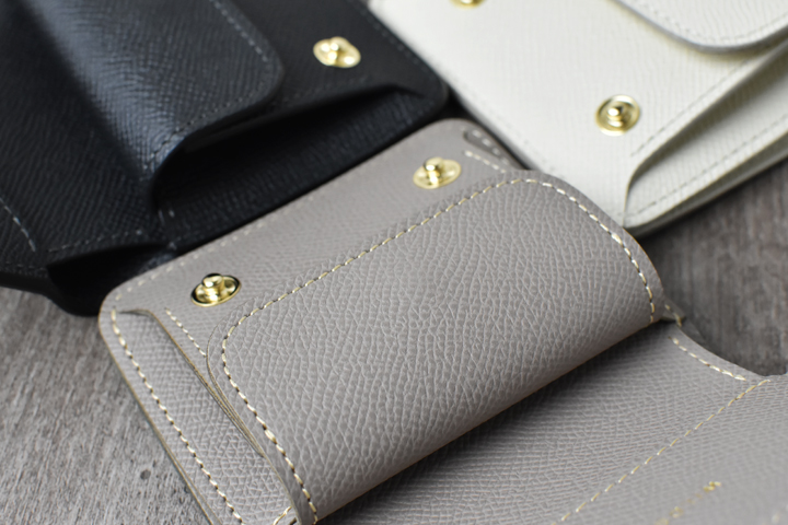 中央の深いポケットには3つ折りにした紙幣も収納可能なため、ちょっとしたミニ財布としてもお使い頂けます。また、こちらのポケットの口元は、出し入れがしやすいよう段差が付いているので、内装のカラーがちらりと顔を覗かせるのもポイントです。