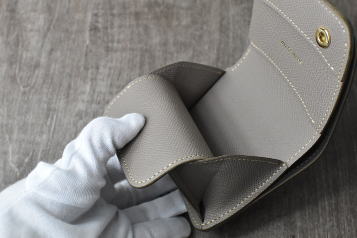内装には、アース社のダービーというレザーを使用しています。フランス・アース社(Tanneries HAAS)は質の高いカーフをメインに世に送り出し続けるタンナーです。ダービーの元となるカーフは生後6か月までの仔牛のことを指し、肌触りの良い柔らかさがあり、傷が少なく見た目も美しい素材です。こちらに型押しを施すことにより革の繊維はギュッと締まり、ハリ感が生まれ、更には傷が付きにくくなるといったメリットも加わります。また、フランスらしいおしゃれなカラーバリエーションと発色も特徴です。