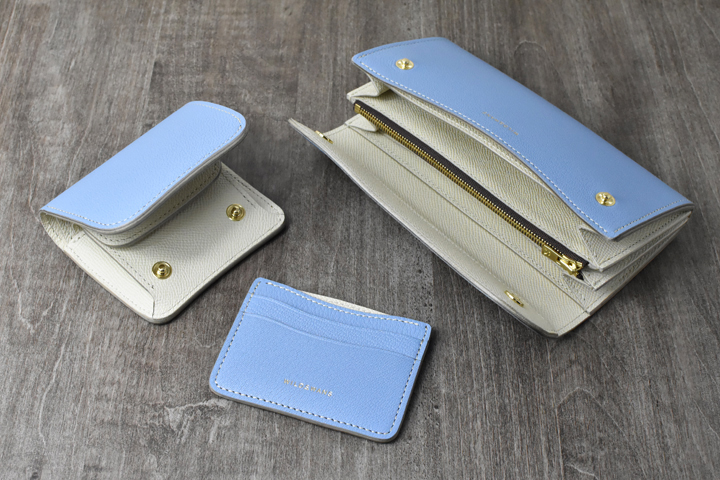 パステルブルーに乳白色を組み合わせ、春を迎え心が浮き立つような配色です。生成り色のステッチがブルーヴィスタに爽やかに馴染み、アイボリーに溶け込みます。