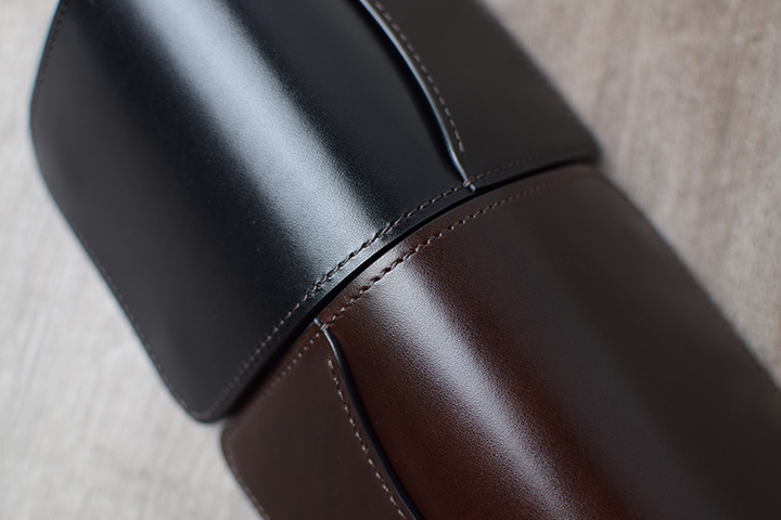 続いてチョコのエイジングサンプルのご紹介です。画像のサドルプルアップENO/チョコは、スタッフが約2年半使用しています。こちらも全体に艶が出ていますが、ブラックとは異なり色味も深く変化しています。