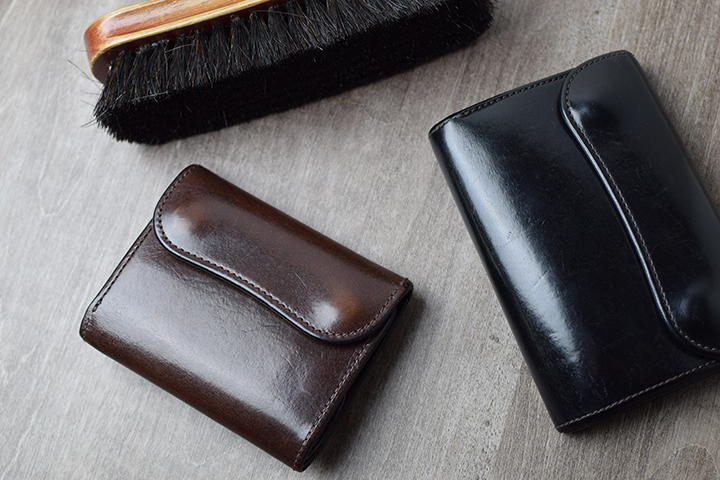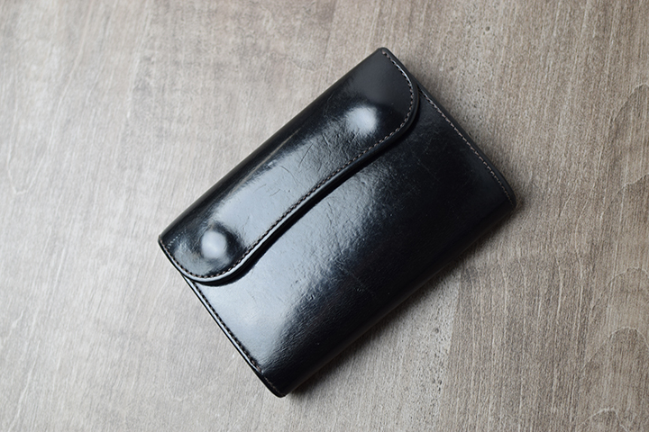 こちらをご覧ください。スタッフが約5年使用した中型三つ折り財布・サドルプルアップBYRNE/ブラックのエイジングサンプルです。元々きれいな艶を持つサドルプルアップですが、使用することでさらに奥深い艶が製品全体を覆います。
