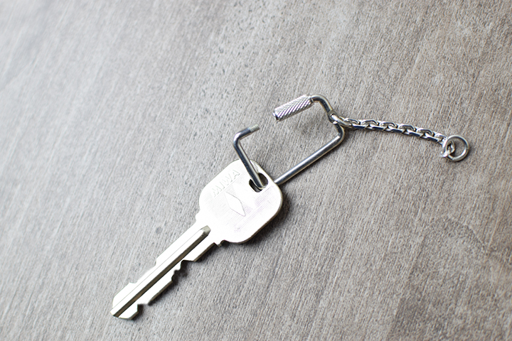 接続方法など詳しく見ていきましょう。まずKEY CHAINとカギを接続しますが、この時カラビナのパーツネジ部分を回して開きます。そして開いたところにカギを装着します。