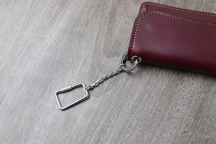 ちなみにこちらで使用しているTONGUE(EYELET)は、イングリッシュブライドルレザーのバーガンディのタイプです。フラップの片側にハトメ加工を施しているので、こちらにカラビナキーリング(S)を通して接続します。