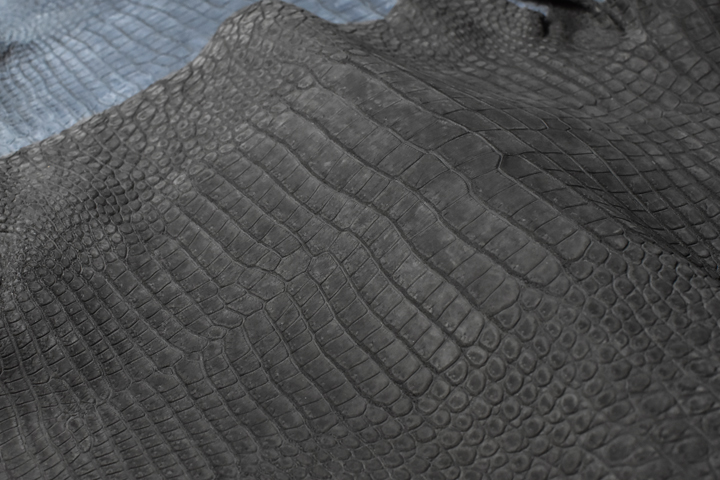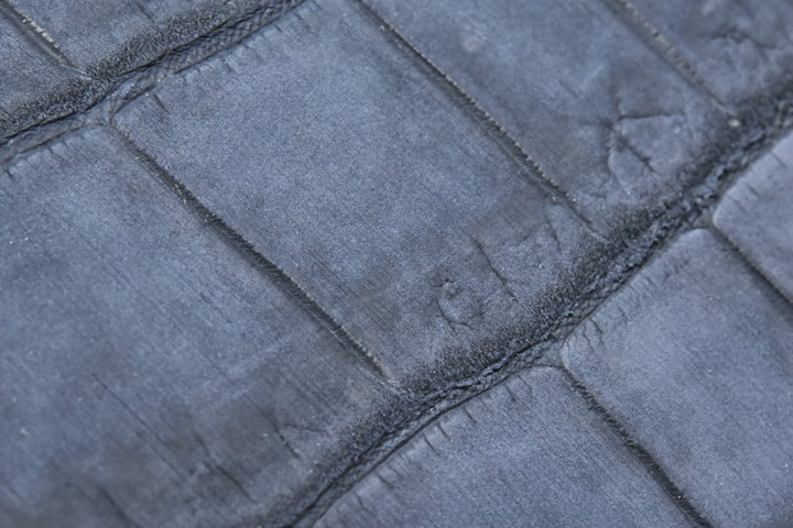 クロコダイルは鱗の一枚一枚が滑らかな風合いですが、この表面にヤスリ掛けのような加工を施して繊維を起こして毛羽立たせます。