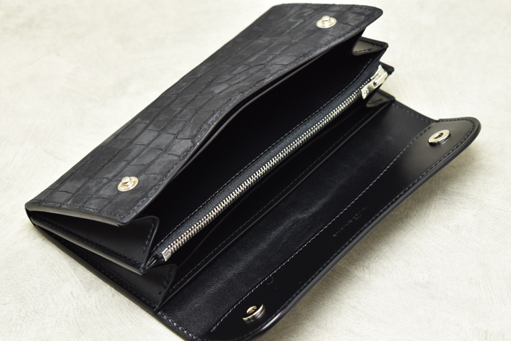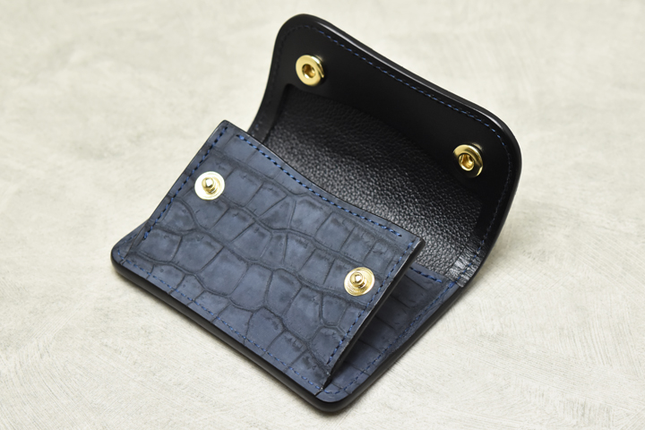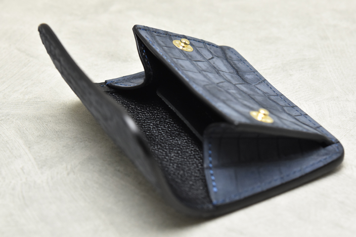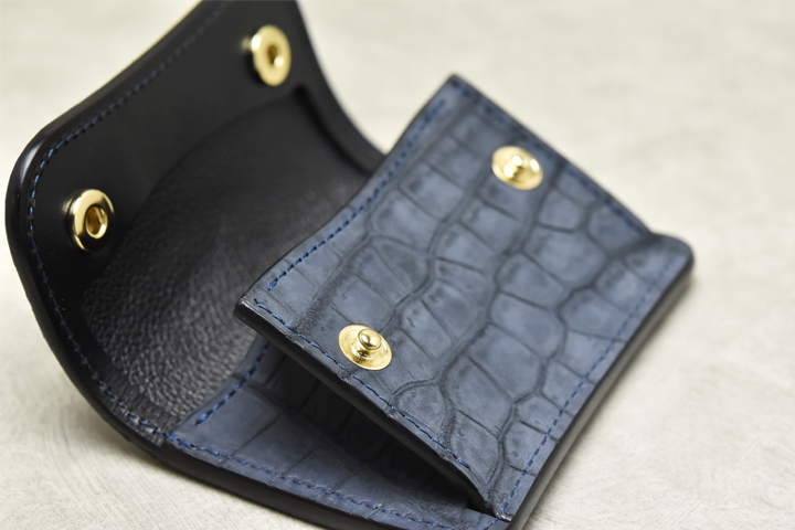 コインケースは左右にマチを備えており、手前に大きく開くことで硬貨の出し入れや中身の確認がしやすい構造になっています。 今回のヌバックポロサスTONGUEはコインケースの前胴部分やマチ部分もクロコダイルを使用しており、外から見える部分は全てヌバックポロサスを用いた贅沢な仕様になっています。