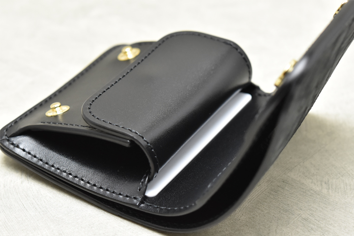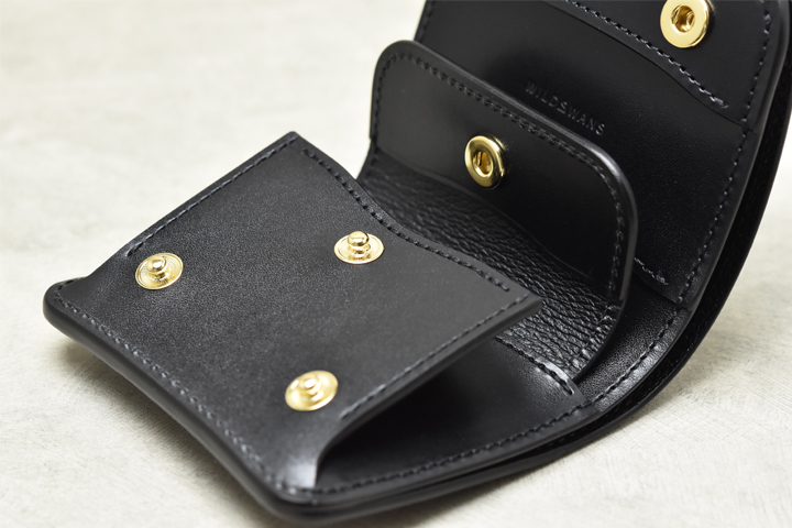※コインケースフラップを動かす際には、必ずコインケースのフラップを開いて(ホックを解除して)から動かして下さい。 閉じたまま無理に動かしてしまうとコインケースのマチの型が崩れて正常に収まらなくなる恐れがあります。