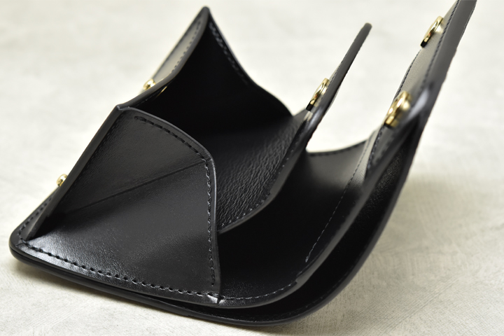 画像ではコインケースを横から見ています。 コインケースの両端のマチは大きく、60°近くまで開きます。 このマチの間をコインケースのフラップが移動し、そうすることでコインケースとカードケースの収納量が変化していきます。