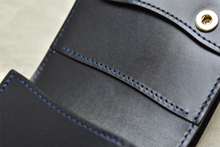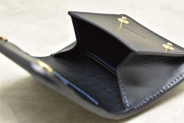 フラップを開くとコインケースが顔を出します。 リニューアルによって裏貼り用の革が無くなり、内装は1種の皮革で統一されました。