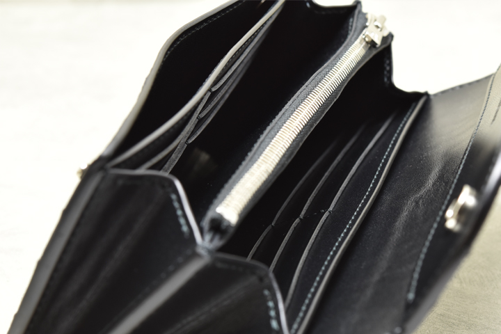 内装は容量、種類共に充実しており、中央に据えられたファスナー式のコインケースを挟んでそれぞれ前後に、6段のカード段を備えた大部屋、マチなしのポケットを備えます。