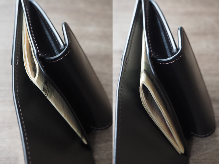 一般的なお財布の札室よりも視認性が高く、出し入れが容易なところが大きな利点です。